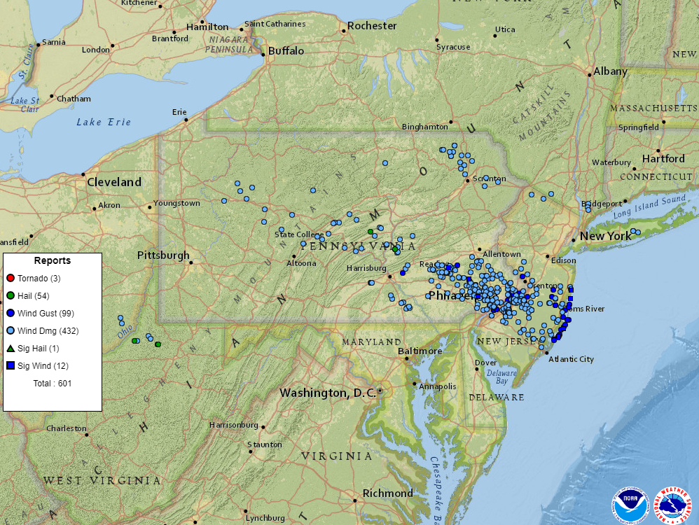- Extensive tree and roof damage reported across highly populated areas of southeastern PA, and NJ.